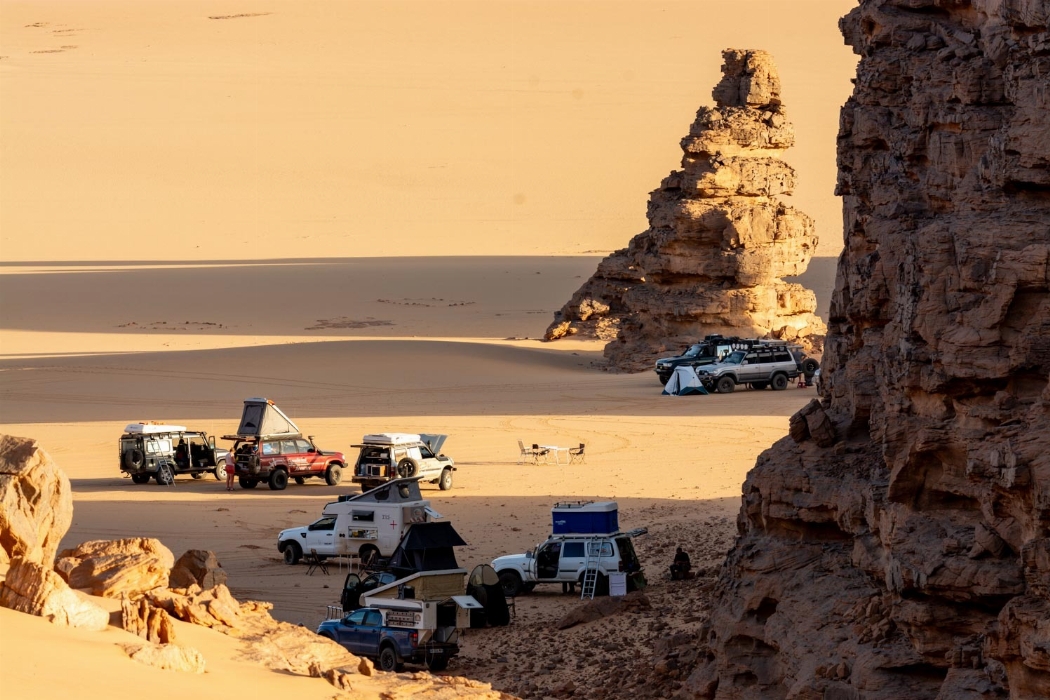 After an early breakfast, we will depart to cross the spectacular dunes, where the sands change color and texture with the wind. Along the way, we will discover ancient rock engravings and paintings, including the famous fresco of Tin Derdjan, a silent witness to past civilizations. Our final destination will be Tin Merzouga, the highest dune in Tadrart, reaching an altitude of 1,013 meters. Lunch will be served along the way before we set up camp at Tin Merzouga. The day will end with a dinner and an unforgettable night under the stars, offering a magical experience in the heart of the desert.