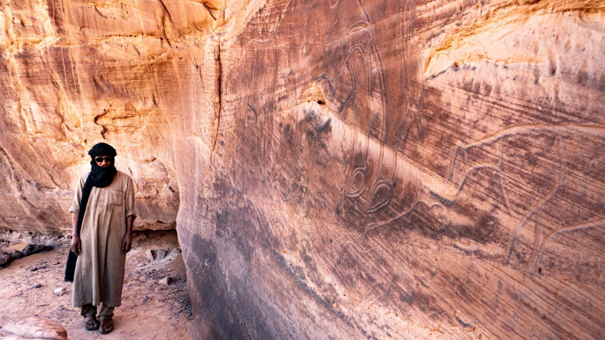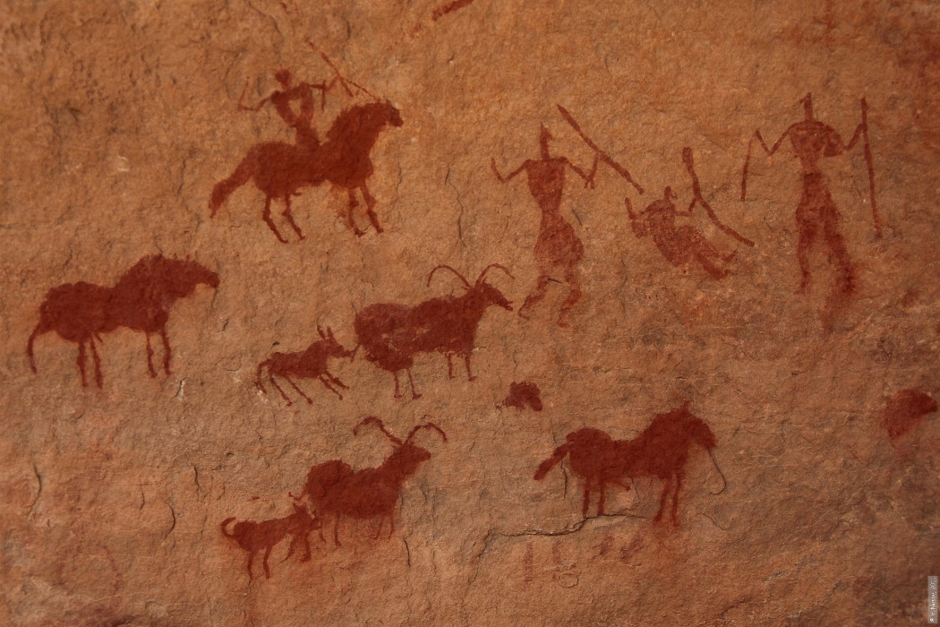 We will leave Tadrart, filled with emotions and beautiful memories, heading towards Djanet. Along the way, we will visit the site of the "crying cows" engravings, drawn on the rock faces of Tigharghart, telling the sad story of the changing times and the disappearance of habitats and resources, marked by the desertification of the region. These engravings, both beautiful and sorrowful, remind us that we are always dependent on Mother Nature. Our adventure will then take us to the city of Djanet for a souvenir stop at the local market. The day will end with dinner, an enjoyable evening, and a transfer to the airport for departure.